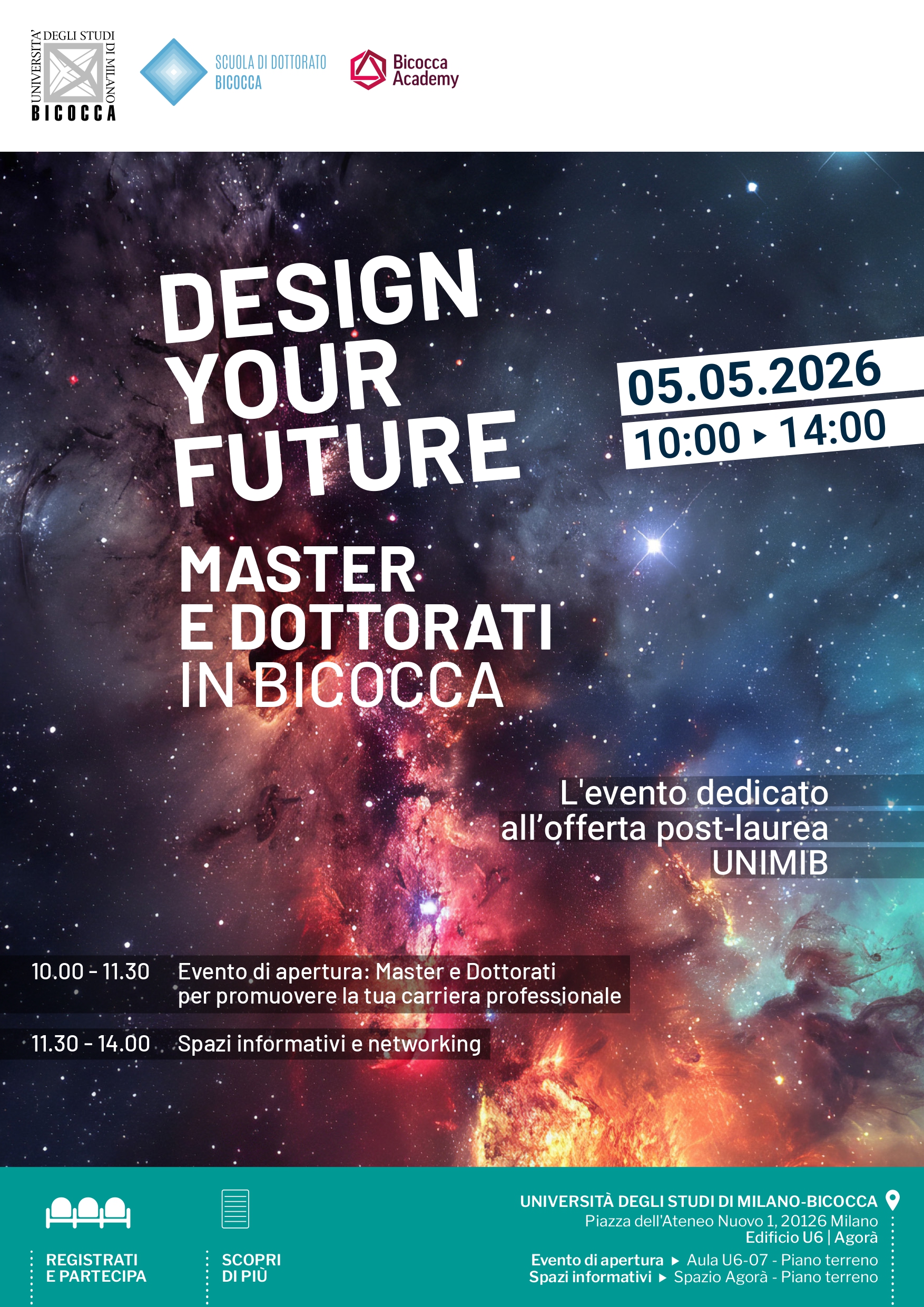 Un nuovo appuntamento per conoscere le opportunità universitarie dopo la laurea: il 5 maggio 2026, dalle ore 10.00 alle 14.00, l’Università di Milano-Bicocca ospita Design Your Future, evento dedicato all’offerta post-laurea di Ateneo. L’iniziativa si svolgerà in presenza, per la prima volta in Ateneo, e si articola in due momenti principali: